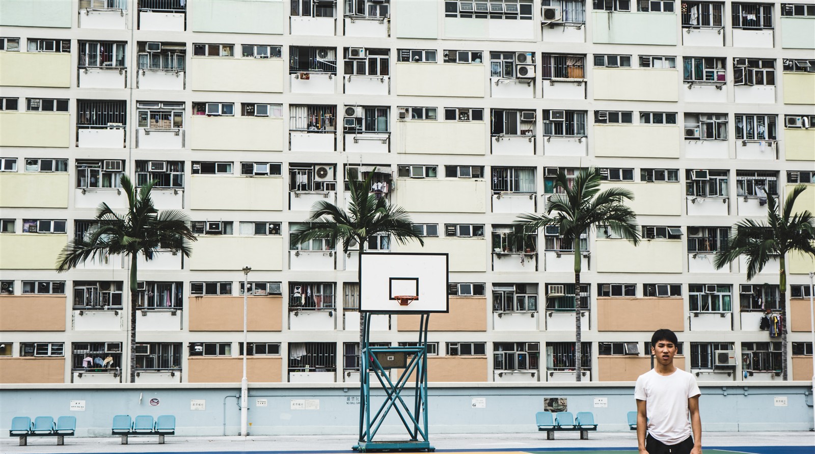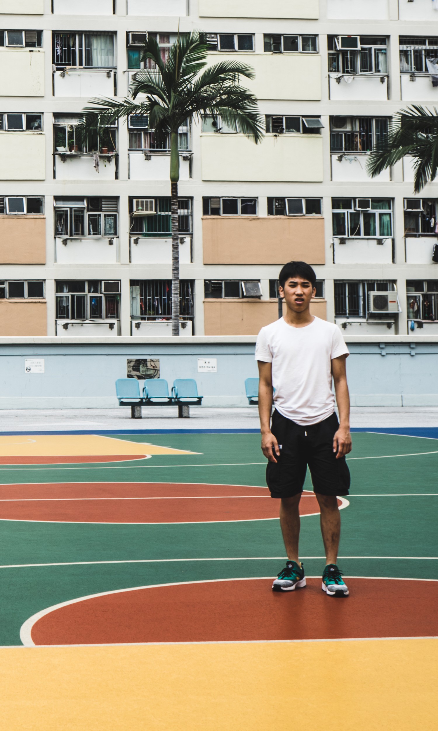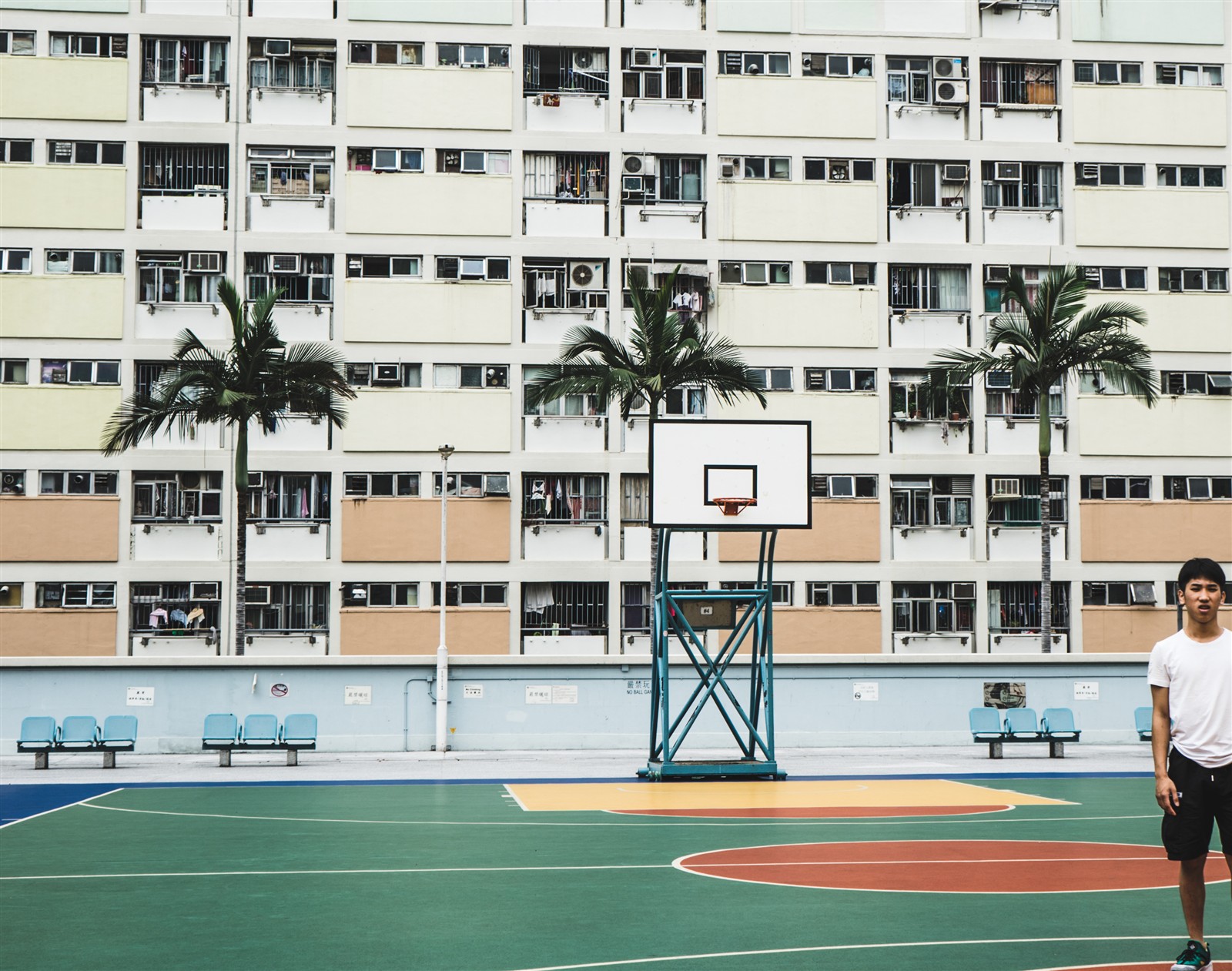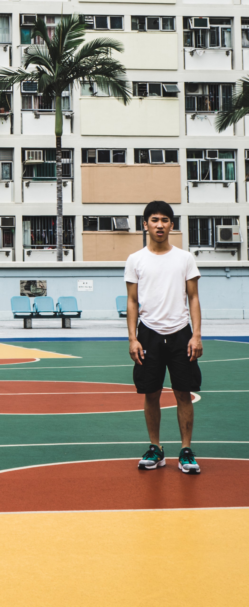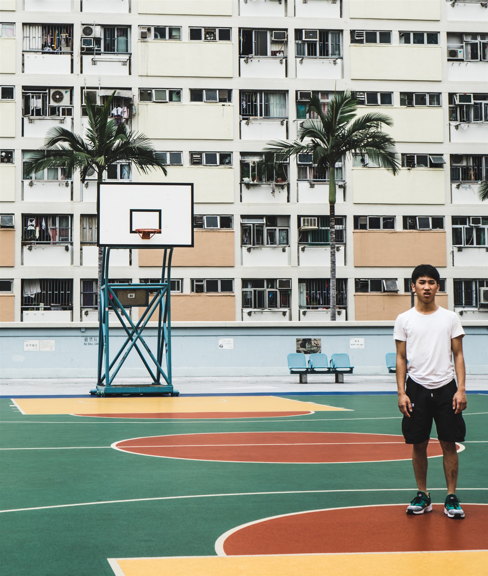 a lone subject in a basketball court, wide shot, urban backdrop - Real reference: Man standing in court (Unsplash),
